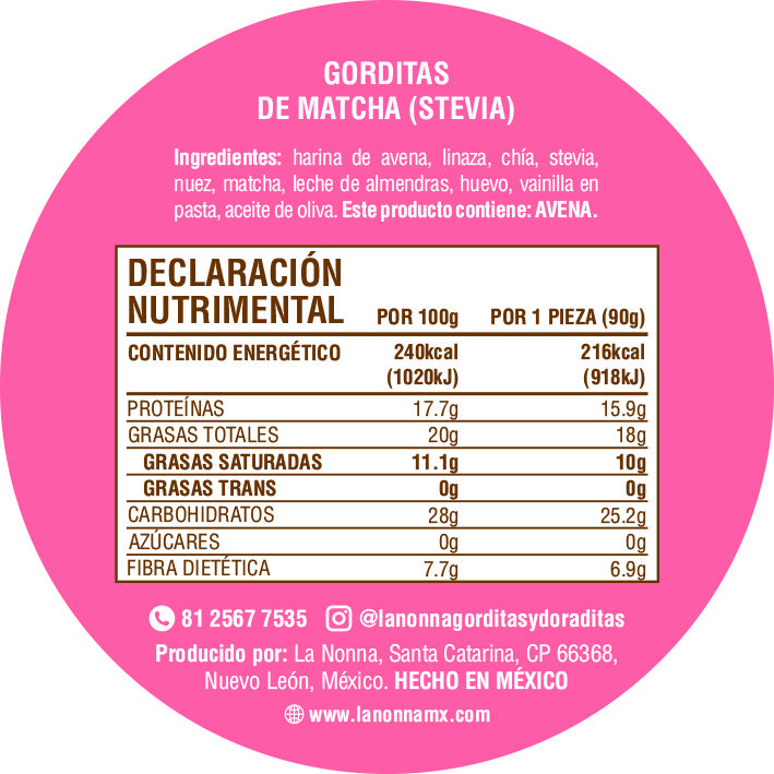 Harina de avena, linaza, chia, stevia, nuez, matcha, leche de almendras sin azúcar, huevo, vainilla,, polvo para hornear, aceite de oliva.